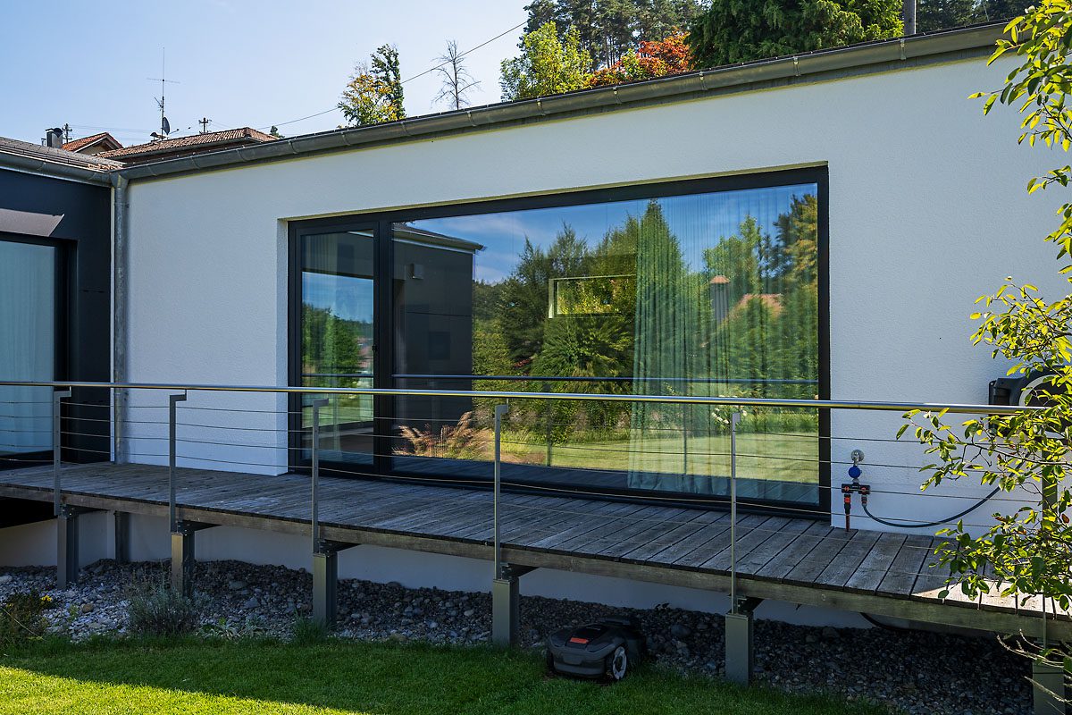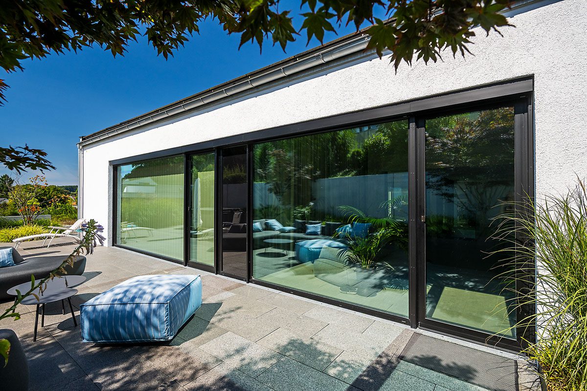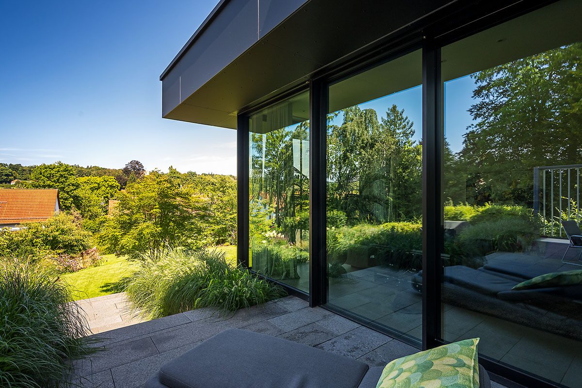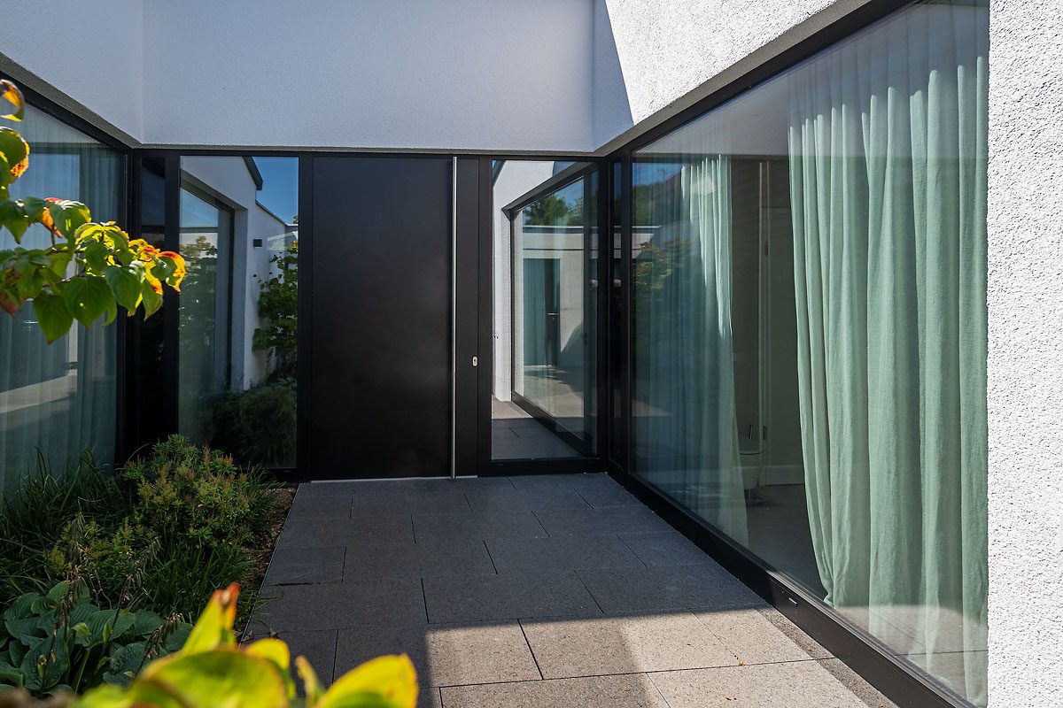 Die Fassaden prĂ€gen den Charakter der HĂ€user maĂgeblich: klare Linien und groĂzĂŒgige GlasflĂ€chen verleihen den GebĂ€uden eine elegante Ausstrahlung und lassen viel Tageslicht in die InnenrĂ€ume. Die verbauten Hebe-Schiebe-Anlagen eröffnen flieĂende ĂbergĂ€nge zwischen Wohnraum und AuĂenbereich â eine Lösung, die gleichermaĂen fĂŒr GroĂzĂŒgigkeit, Komfort und barrierearme Nutzung steht.