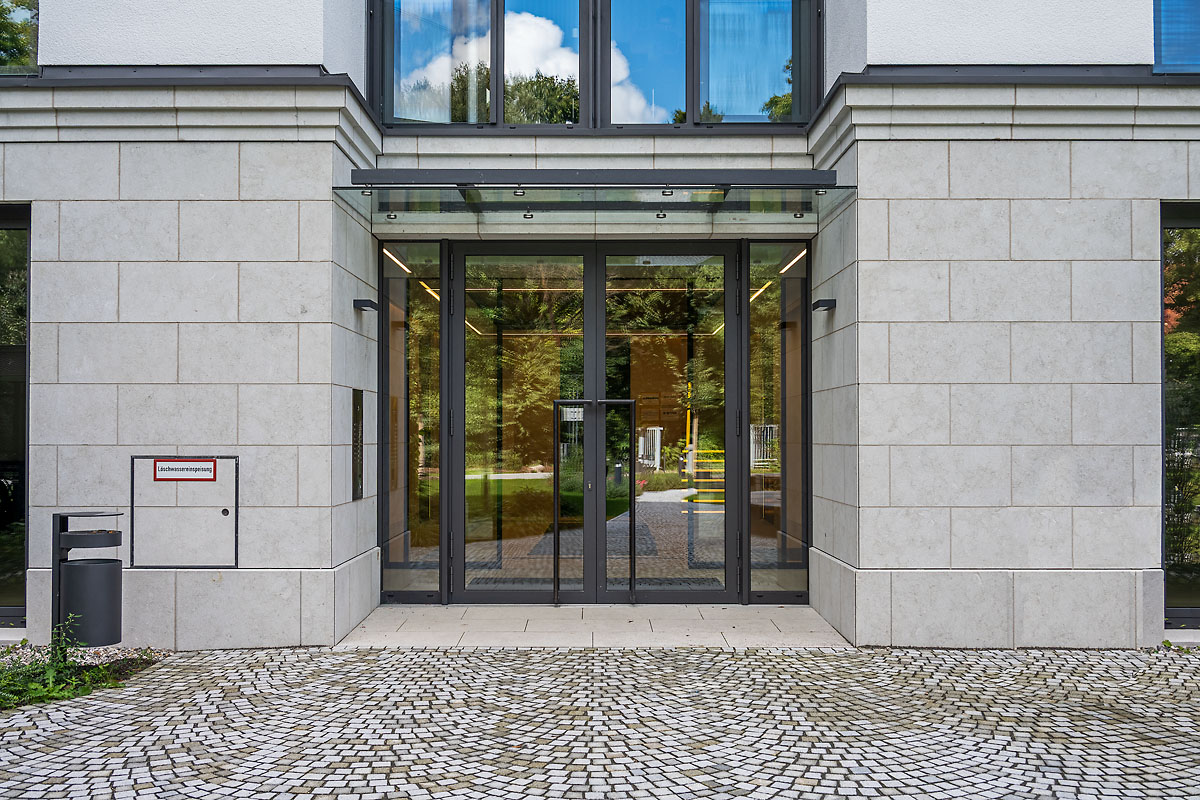 Vom Erdgeschoss bis ins vierte Obergeschoss wurden weitere BrandschutztĂŒren des Systems ADS 90 FR 30 eingebaut. Diese sind vollstĂ€ndig mit Aluminiumverkleidungsblechen abgedeckt, was ihnen eine besonders klare und hochwertige Anmutung verleiht. Direkt angrenzend wurden Sprechanlagen in die Wand integriert, deren Blechverkleidung gestalterisch eine Einheit mit den TĂŒranlagen bildet â ein gelungenes Zusammenspiel von FunktionalitĂ€t, Sicherheit und architektonischer PrĂ€zision.